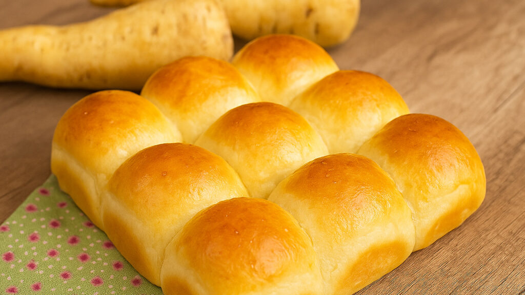 O cheirinho desse pão assando é de dar água na boca. Além de saboroso, ele é mais leve que os pães comuns e pode ser servido com manteiga, requeijão, geleia ou até usado como base para sanduíches artesanais. A mandioquinha, também chamada de batata-baroa, traz uma textura única e ajuda a manter o pão úmido por mais tempo, mesmo depois de frio.